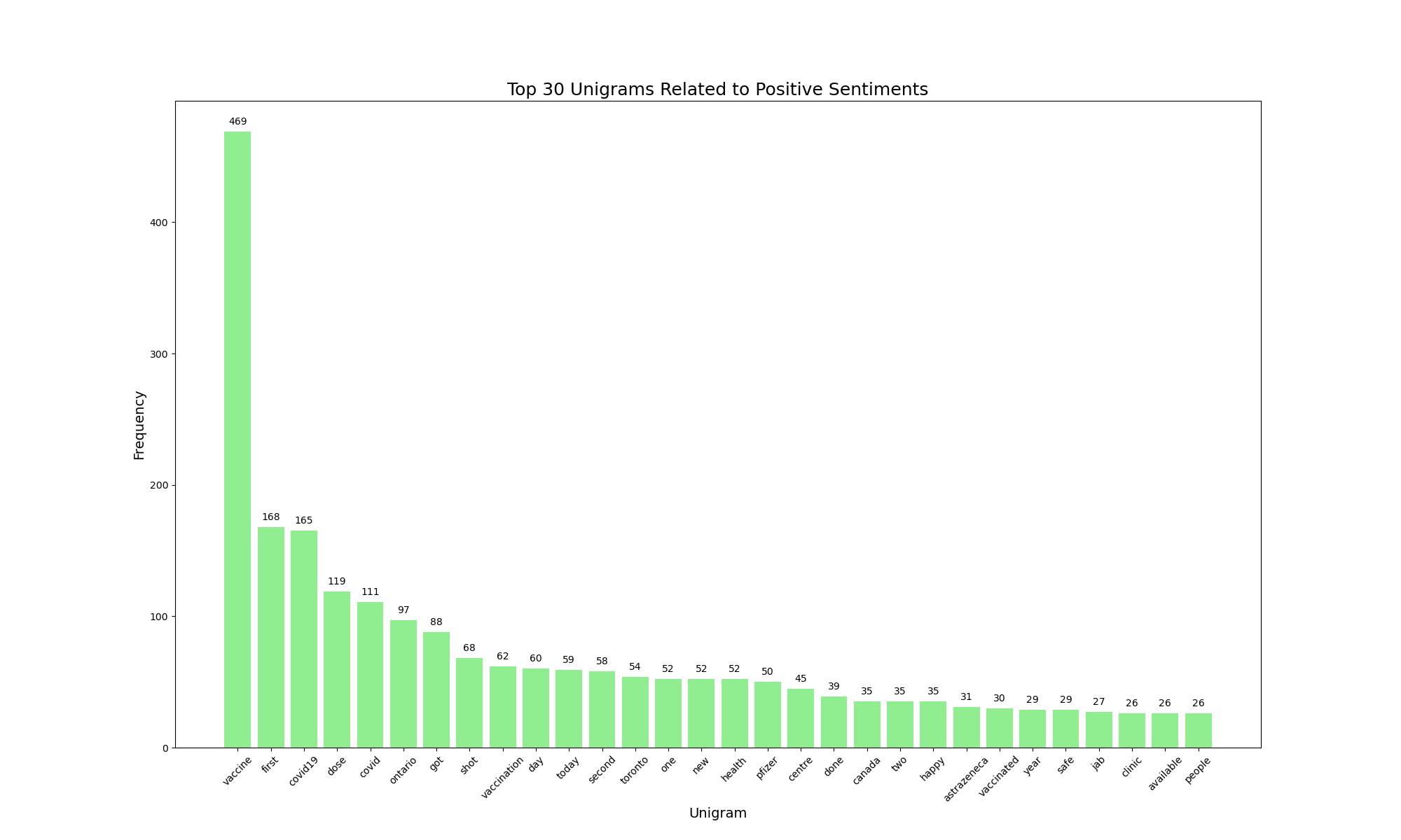 I visualized n-grams to see words and phrases associated with COVID-19 vaccine-related tweets. Click on each of the following images to enlarge it.
