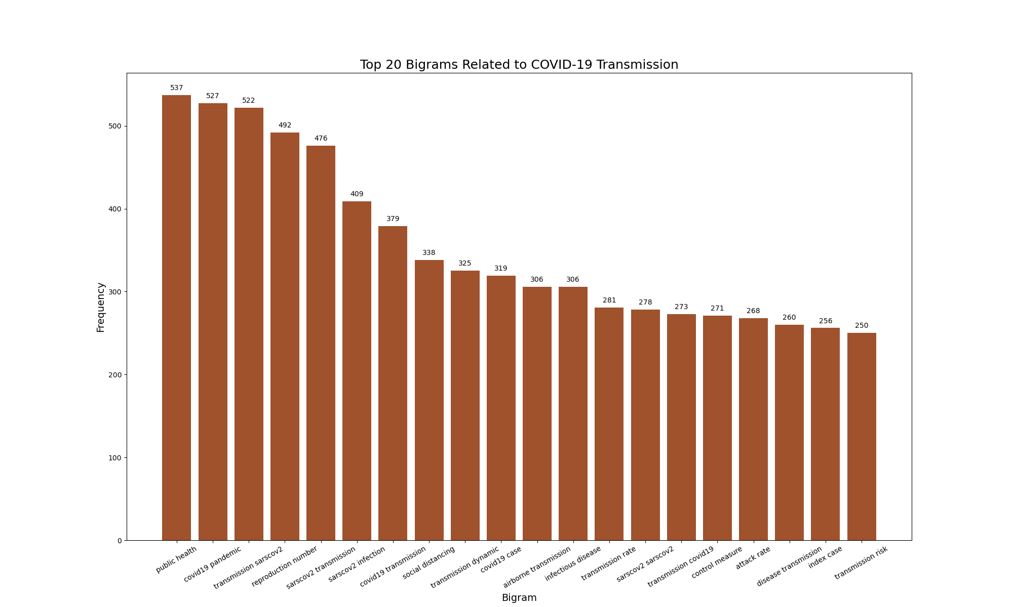 As expected, unigrams such as transmission and COVID-19 appear most frequently in COVID-19 transmission-related articles. Bigrams such as social distancing and airborne transmission are also commonly seen in the data. Trigrams on control measures such as personal protective equipment, public health measures, and nonpharmaceutical interventions npis frequently appear in the data.