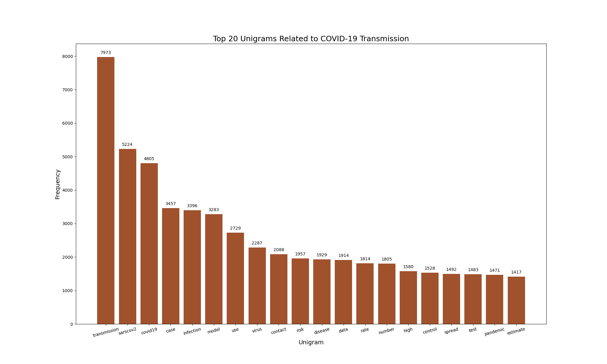 I created and visualized n-grams in the data to see words and phrases associated with COVID-19 transmission. Click on each of the following images to enlarge it.